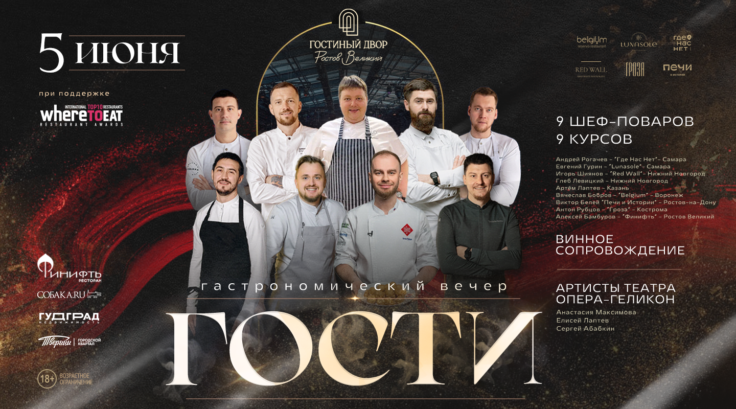 5 июня состоится одно из самых ярких гастрономических событий года. В этот вечер Ростов Великий станет точкой притяжения именитых шеф-поваров России. На одной кухне соберутся мастера из разных городов страны — от Санкт Петербурга до Самары, чтобы создать уникальный ужин. Особую атмосферу вечера создаст живая музыка, в зале прозвучат произведения в исполнении ведущих оперных артистов театра Геликон-Опера. Проект реализуется при поддержке международной ресторанной премии WHERETOEAT, одного из ключевых ориентиров в индустрии, объединяющего ведущих шеф-поваров, рестораторов и экспертов гастрономии.